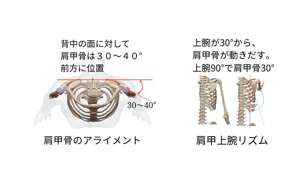 肩甲骨は30°~前方になるので、腕も少し斜めに上げます。