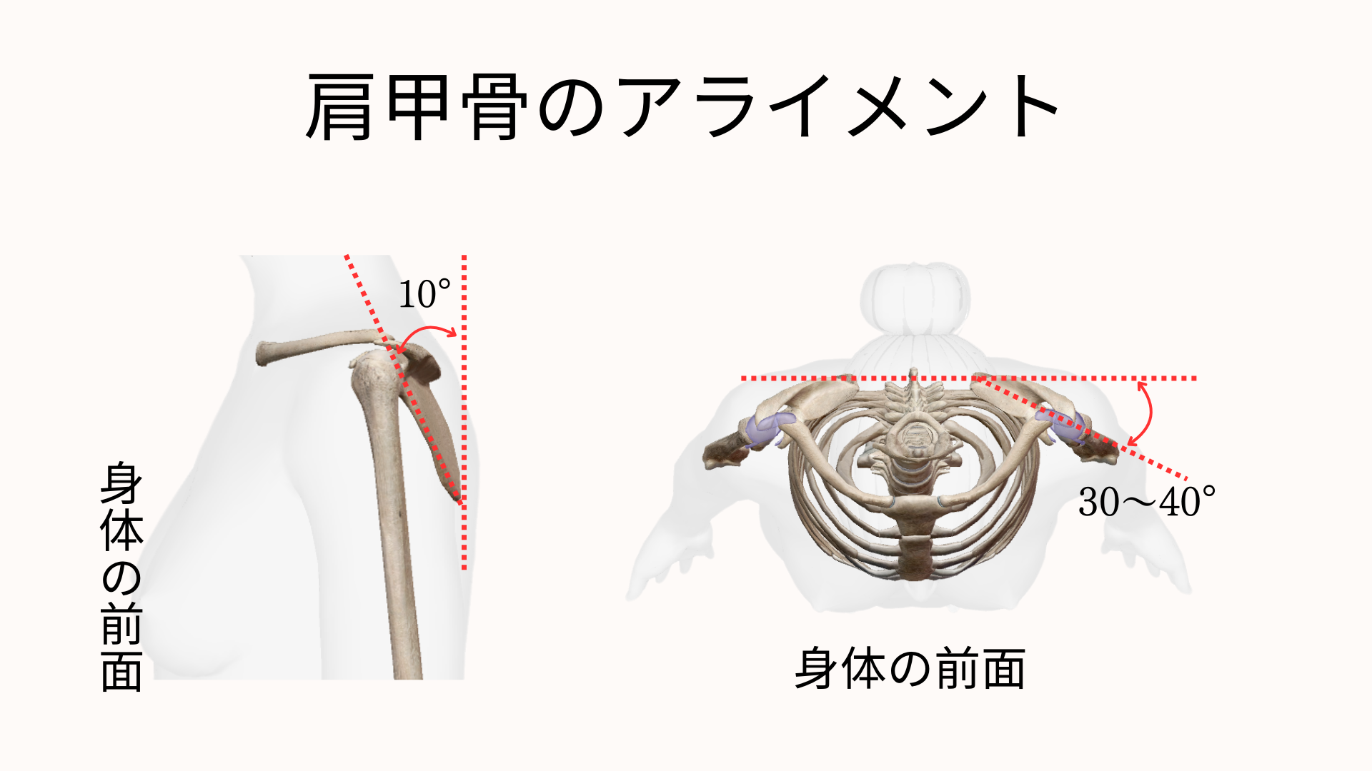 画像のアライメント通り、肩甲骨はもともと少し前傾・下方に角度があり、外側(肩峰側)はわずかに浮いてOKです。