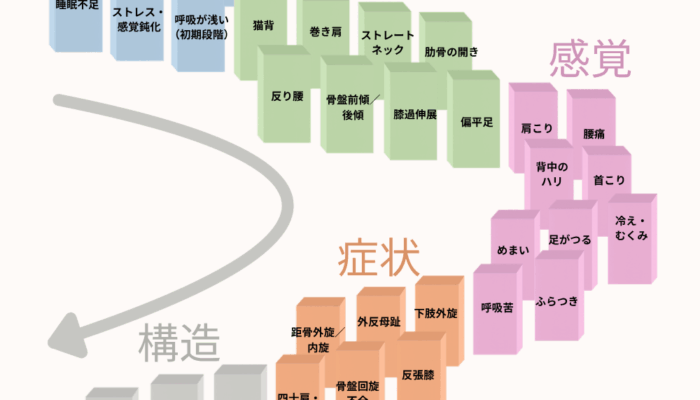 からだドミノ™多くの人が進行した「症状の段階」で気づく気づかないうちに、体は少しずつ傾いていく。日々の姿勢や呼吸、感覚のズレが積み重なり、やがて痛みや変形につながっていく。多